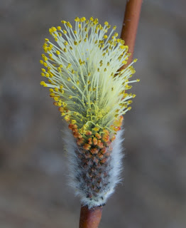 Näitä sitten tulee pieni keko. Riittää seuraavaksikin päiväksi. Muuta ei ruuaksi tarvitsekaan, siinähän on leipä, rasva ja vihannes samassa. Eikä tarvitse välttämättä lautasiakaan, syötiin tänäänkin suoraan keosta sormin samalla kun niitä tehtiin. Ei paljon tiskiä. Kelpaa koirallekin.Sillä aikaa kun tempuroita keitettiin, kimalaiset paiskoi töitä. Nyt on oikein hyvä pajujen kukintavuosi. Paljon kukkia, eikä pahoja yöpakkasia. Olen jotensakin tykästynyt näihin pajujen kukkiin. Kiiltopajua tämäkin.